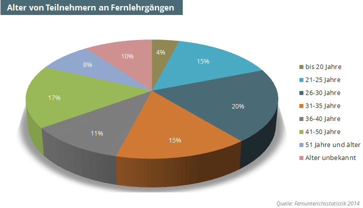 Dass man selten zu alt zum Lernen ist, zeigt auch die Fernunterrichtsstatistik 2014. Hier geht es zwar vor allem um Fernkurse ohne akademischen Abschluss, dennoch zeigt die Statistik, dass „nur“ rund 50% der Studierenden unter 35 Jahre sind.